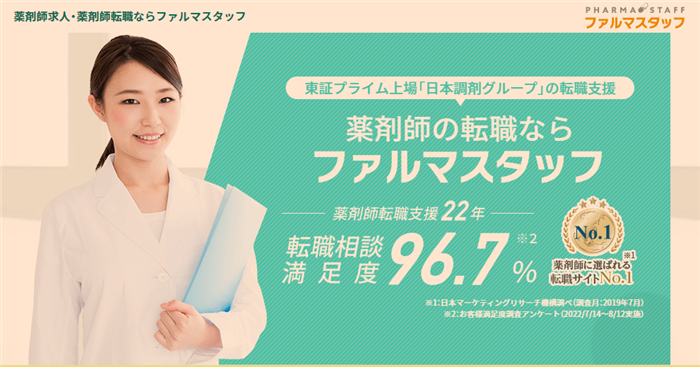ファルマスタッフは、「薬剤師に選ばれる転職サイトNo.1」であり、求職者の転職相談満足度が96.5%の高評価を得ている転職エージェントです。
